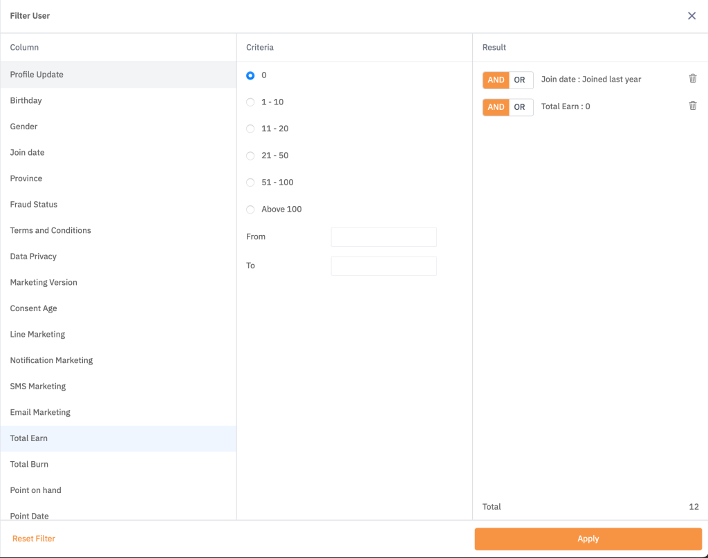 - Criteria will allow client to specify what they need to filter (Ex. End user who registered last year and total earn point = 0)