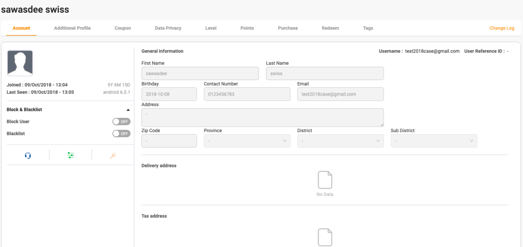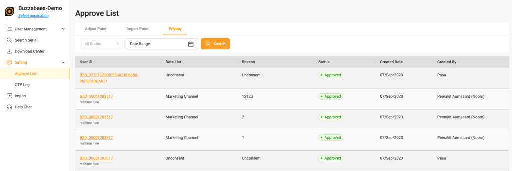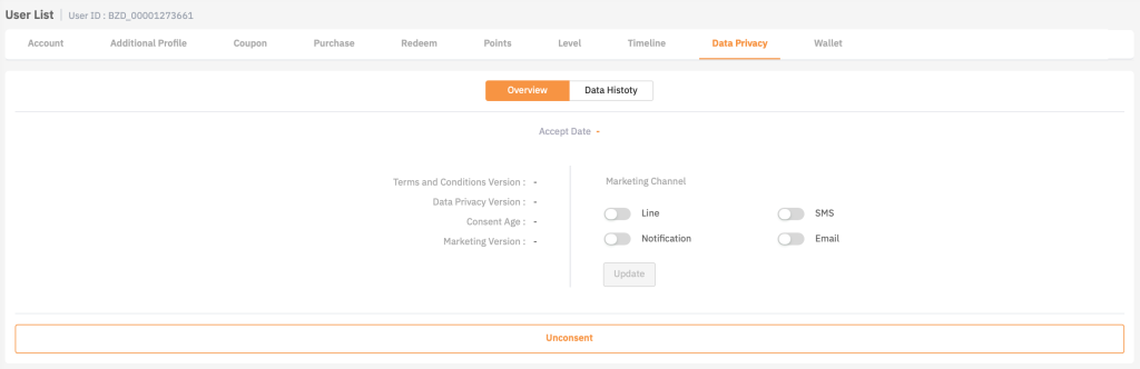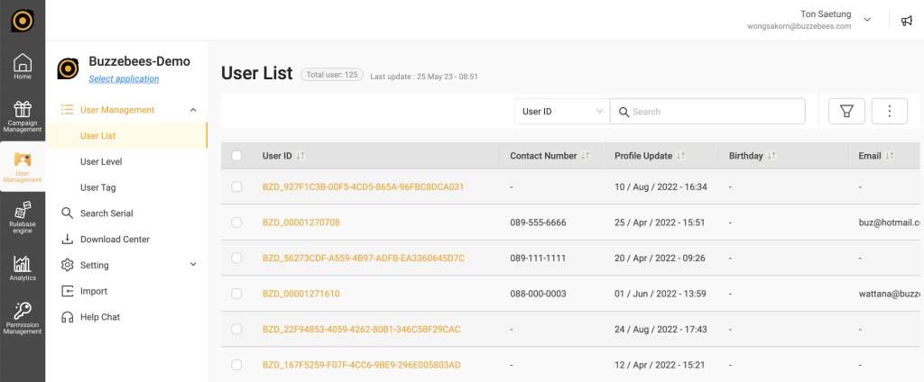 User Management is client data management system (End User) which allows Buzzebees’s client to search for user data (End User) and manage data under their consent including analyze customer’s behavior upon using app and collect data to plan and strategize for customer’s need. Currently, all data will be shown as per below: