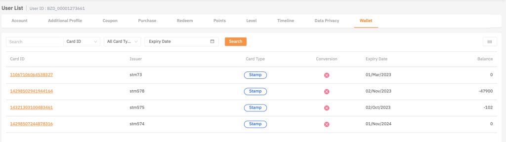 Only specific applications have this tab which display wallet detail of end user such as card number, card type, and expiry date which is exportable as file.