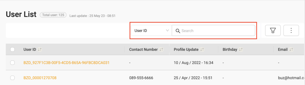- All : Search by any fields including UserID, Contact Number First Name, LastName, Email