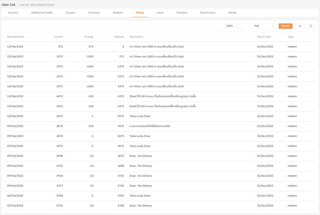 แสดงรายการ earn และ burn point ของลูกค้า (End user) ว่าเป็นคะแนนจากอะไรบ้าง โดยสามารถค้นหาเป็นรายเดือนหรือปี และยังสามารถ Export ได้