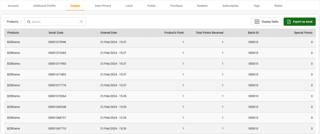Tab นี้จะมีแค่บาง application เท่านั้น เพราะเป็น tab ที่แสดงรายละเอียด coupon ที่ลูกค้า (End user) ใช้ เช่น แสดง serial ใต้ฝาหรือในห่อต่างๆ ที่เกิดจากการสแกนข้อมูลเพื่อรับคะแนน เป็นต้น