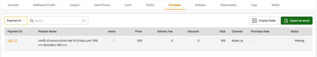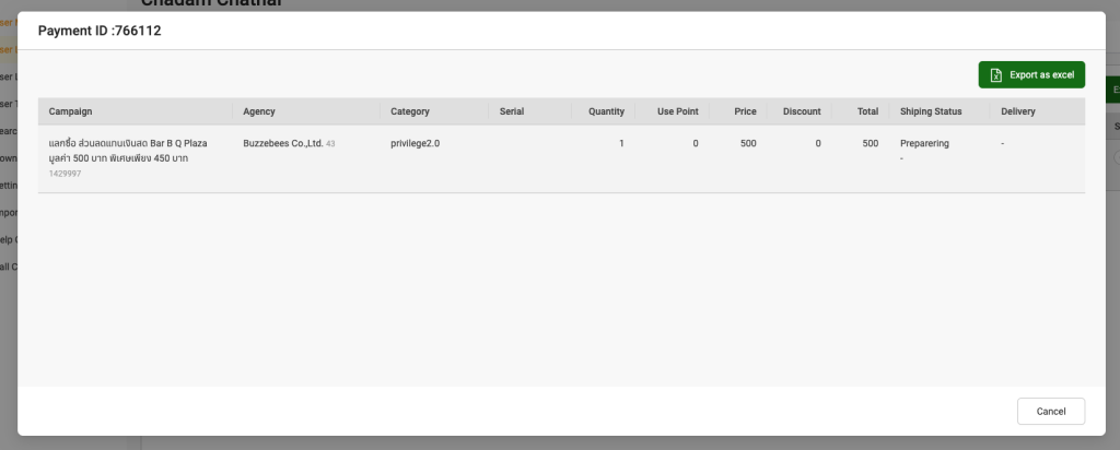 แสดงรายการสินค้าที่ซื้อผ่าน Shopping cart (type buy) ของลูกค้า (End user) โดยสามารถดู transaction (Payment) และ transaction detail (Payment ID) ได้ว่ามีสินค้าประเภทอะไรบ้าง จำนวนราคาเท่าไหร่ โดยการกด link ที่ Payment ID และยังสามารถ export transaction (Payment) ได้ด้วย