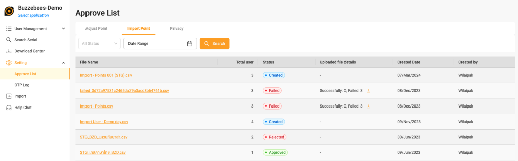ใช้สำหรับการอนุมัติการเพิ่มคะแนนให้กับผู้ใช้ทีละหลายๆคน สามารถ download ผู้ใช้งานที่ไม่สามารถเพิ่มคะแนนได้
