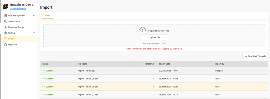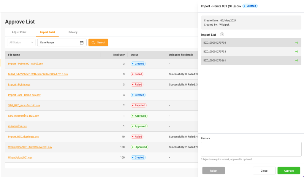 ใช้สำหรับ Import point ให้กับผู้ใช้โดยวิธีการ Upload เป็นไฟล์ โดยจะมี Template ให้สามารถ Download มาใช้งานได้