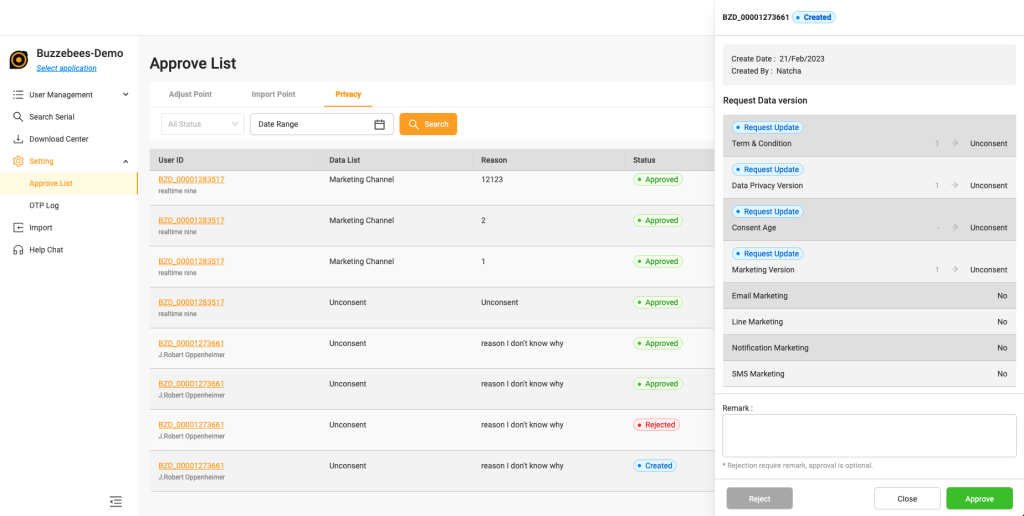 โดยระบบสามารถทำเรื่อง Filter ข้อมูลเพื่อที่ ลูกค้าของ Buzzebees(Client) สามารถจัดกลุ่มของลูกค้าเพื่อนำข้อมูลไปทำ Marketing ต่อได้ เช่น Filter ข้อมูลของลูกค้าที่เป็นเพศชายทั้งหมด หรือ เพศหญิงทั้งหมดได้ หรือรวมทั้งการทำ Marketing เกี่ยวกับแคมเปญที่เราต้องการโปรโมทภายในพื้นที่แต่ละจังหวัดก็สามารถทำได้
