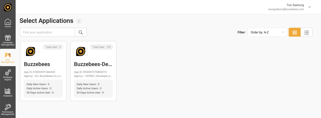 เป็นหน้าจอสำหรับเลือกแอพพลิเคชั่นเพื่อไปจัดการข้อมูลของลูกค้าและแสดงจำนวนข้อมูลของลูกค้า (End user) ในแอพพลิเคชั่นนั้นๆ โดยหน้านี้จะแสดงข้อมูลเป็น (Day-1) ถ้าต้องการค้นหา User แบบ Realtime เช่นคนที่พึ่งสมัครเข้ามาภายในวันนี้ จะต้องทำการกดปุ่ม Realtime data เพื่อทำการค้นหา User