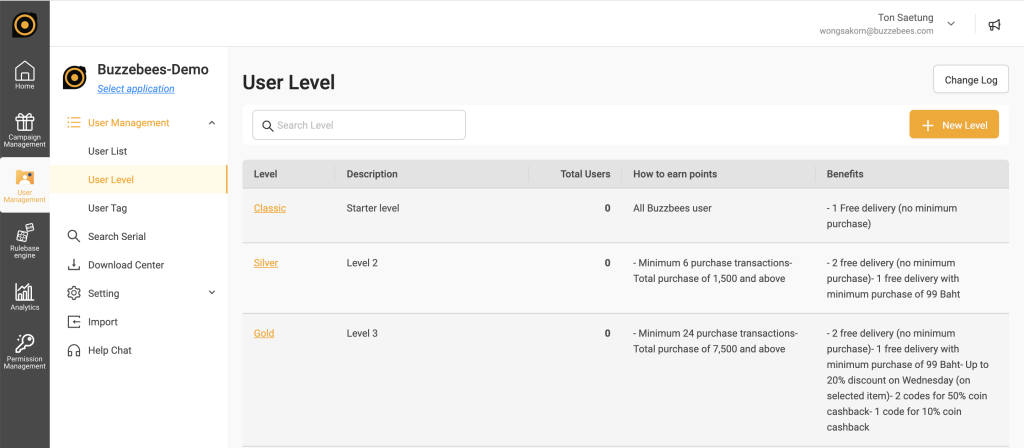 แสดง level ทั้งหมดของของลูกค้า (End user) ว่ามีอะไรบ้าง ได้รับมาเมื่อไหร่ และจะหมดอายุเมื่อไหร่