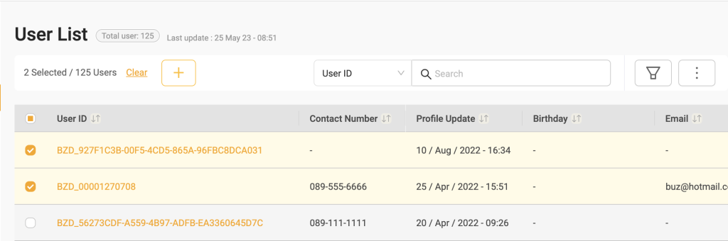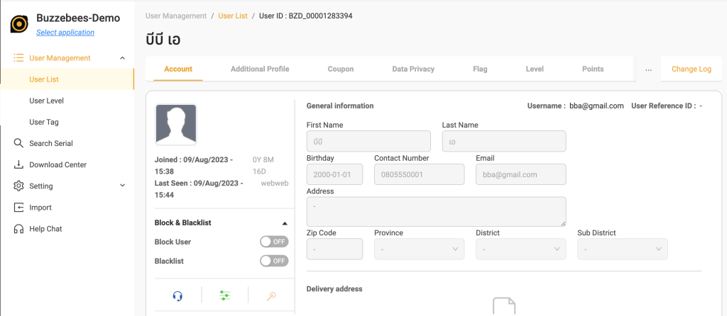 User Management เป็นระบบจัดการการเข้าถึงข้อมูลของลูกค้า (End user) ซึ่งจะทำให้ลูกค้าของ Buzzebees(Client) สามารถค้นหาข้อมูลของลูกค้า (End user) จัดการข้อมูลลูกค้า ภายใต้ความยินยอมของลูกค้า รวมถึงสามารถศึกษาพฤติกรรมการใช้งานแอพพลิเคชั่นของลูกค้า (End user) เพื่อนำไปวางแผนและวิเคราะห์ความต้องการของลูกค้าเพื่อประโยชน์ในอนาคตได้ โดยปัจจุบันระบบแสดงข้อมูลดังต่อไปนี้